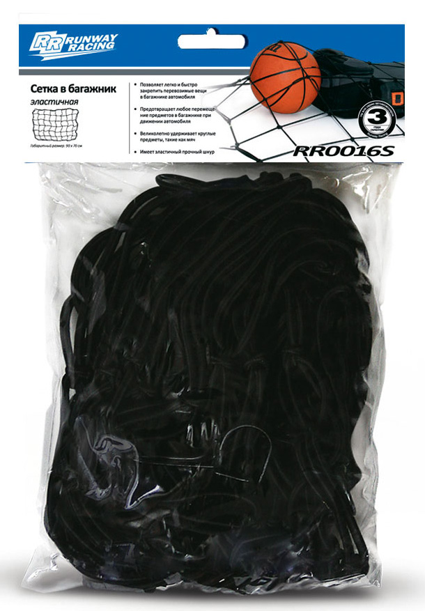 Сетка "Runway Racing" позволяет быстро и легко закрепить перевозимые вещи в багажнике автомобиля. Предотвращает любое перемещение предметов в багажнике при движении автомобиля. Великолепно удерживает круглые предметы, такие, как мяч. Имеет эластичный прочный шнур и усиленные крюки.