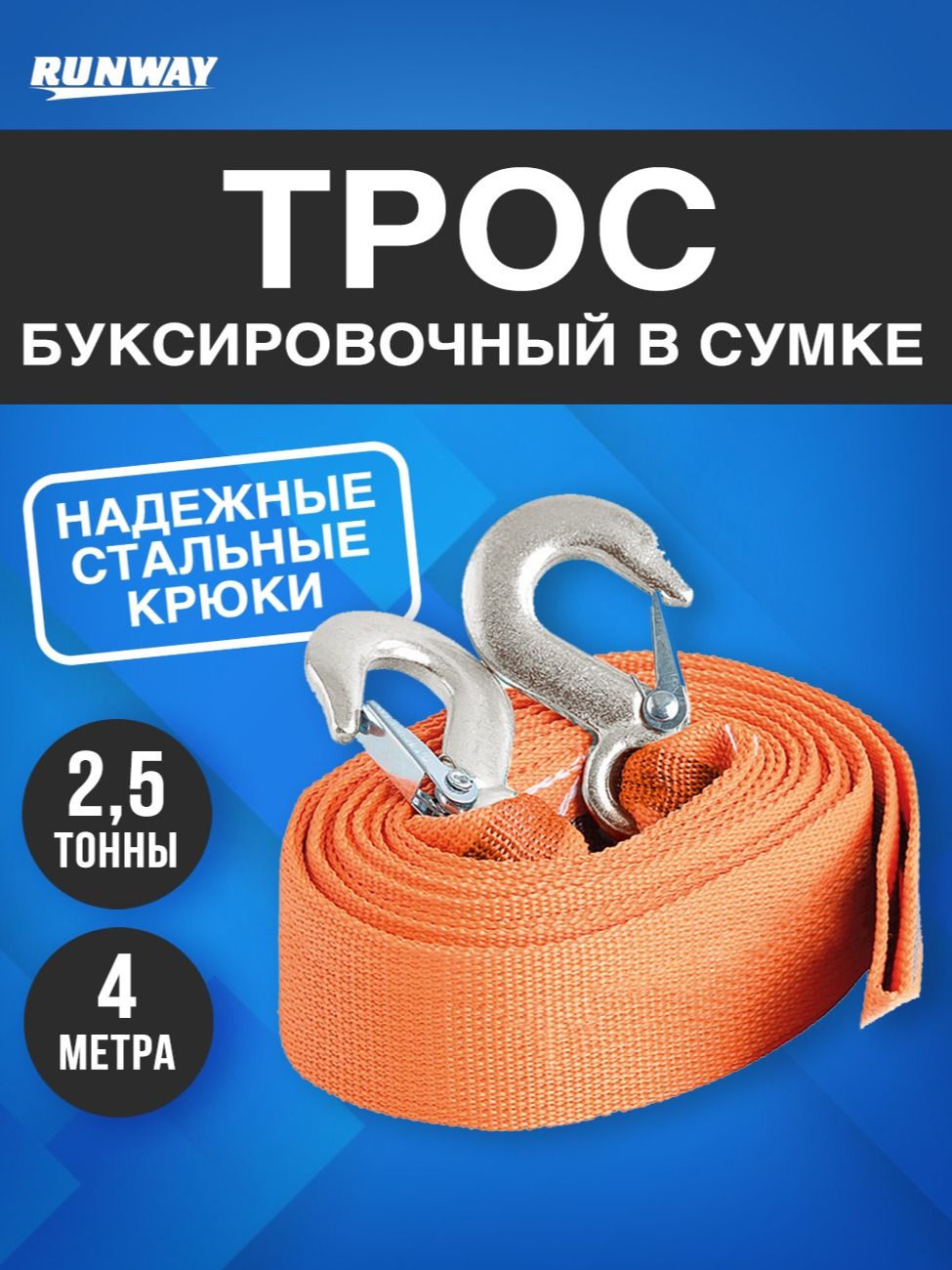 Трос буксировочный "Runway Racing" - предназначен для буксировки транспортных средств. Соответствует ПДД. Длина 4 метра.<br/><br/>Трос - незаменимое приспособление в багажнике любого автомобиля. <br/><br/>Трос "Runway Racing" Позволяет вытягивать застрявшие, а также транспортировать неисправные средства.<br/><br/>Высокое качество используемых материалов гарантирует безопасную эксплуатацию. Не подвержен воздействию окружающей среды, не боится низких температур. <br/><br/>Правила эксплуатации: не допускайте провисания троса, рывков, попадание троса под колеса!