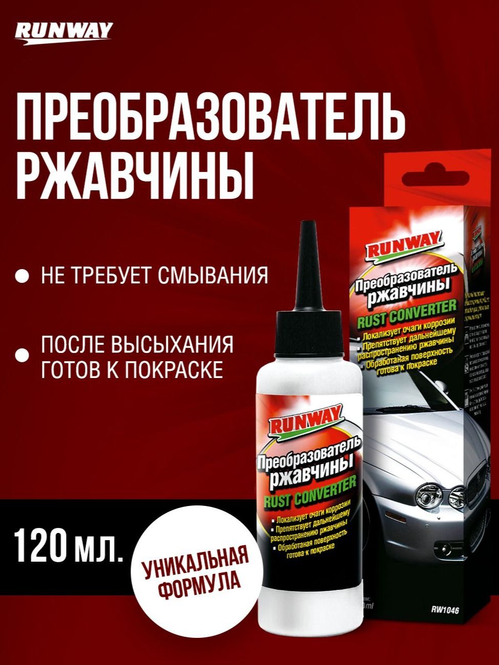 Преобразователь, удалитель ржавчины Runway - это уникальный состав, не имеющий аналогов на российском рынке. Безопасный, удобный в применении профессиональный продукт, который быстро преобразует плотные слои ржавчины в инертные соединения черного цвета. В результате использования преобразователя ржавчины создается антикоррозийное покрытие типа грунта, которое в дальнейшем можно использовать, в качестве основы для окрашивания.