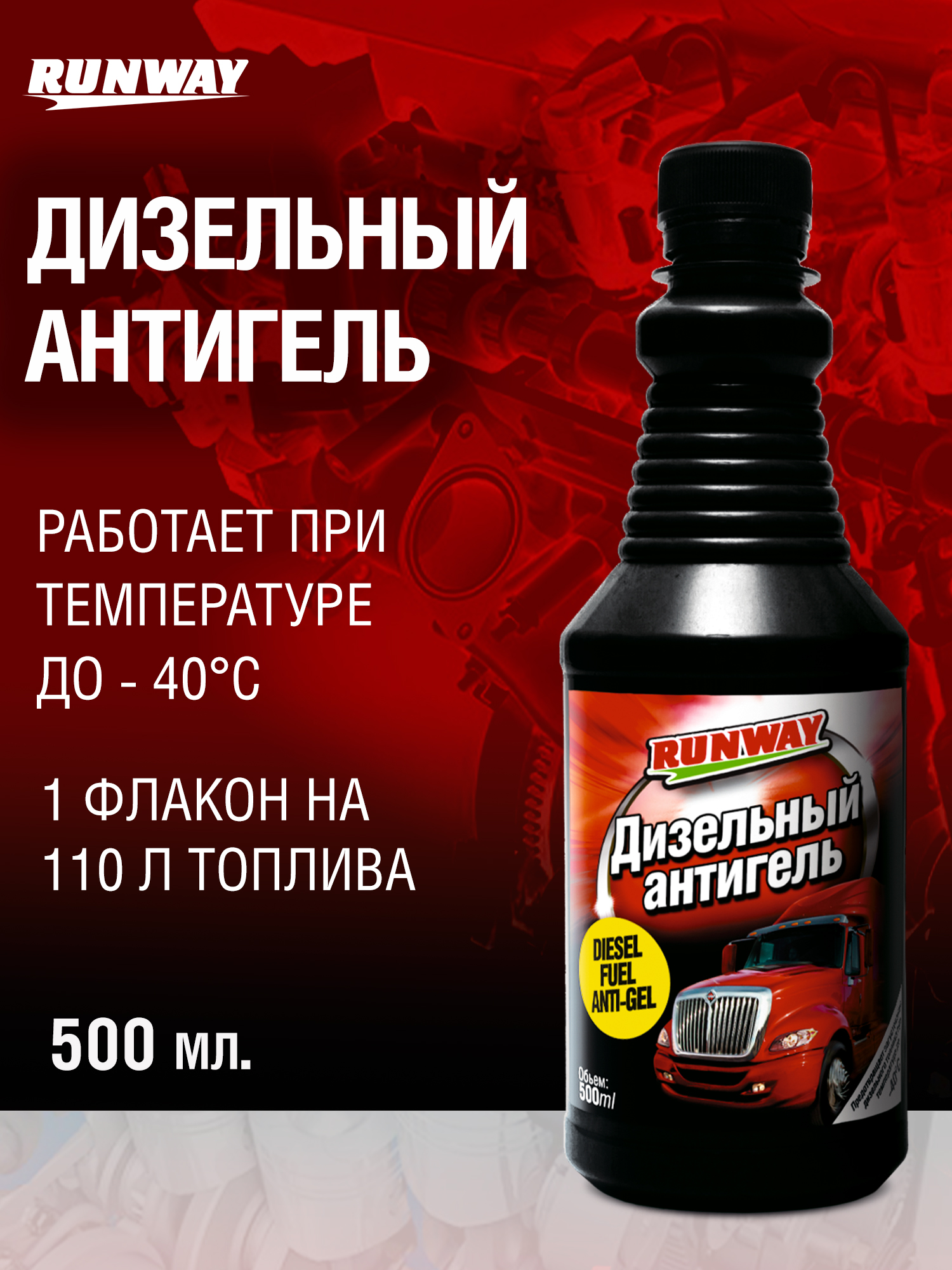Дизельный антигель "Runway" препятствует росту восковых кристаллов и загустеванию дизельного топлива при низких температурах. Предотвращает загустевание дизельного топлива при температурах до -40°С. Снижает предельную температуру фильтруемости до -36°С. Предотвращает замерзание топливной системы. Совместим со всеми видами дизельного топлива.