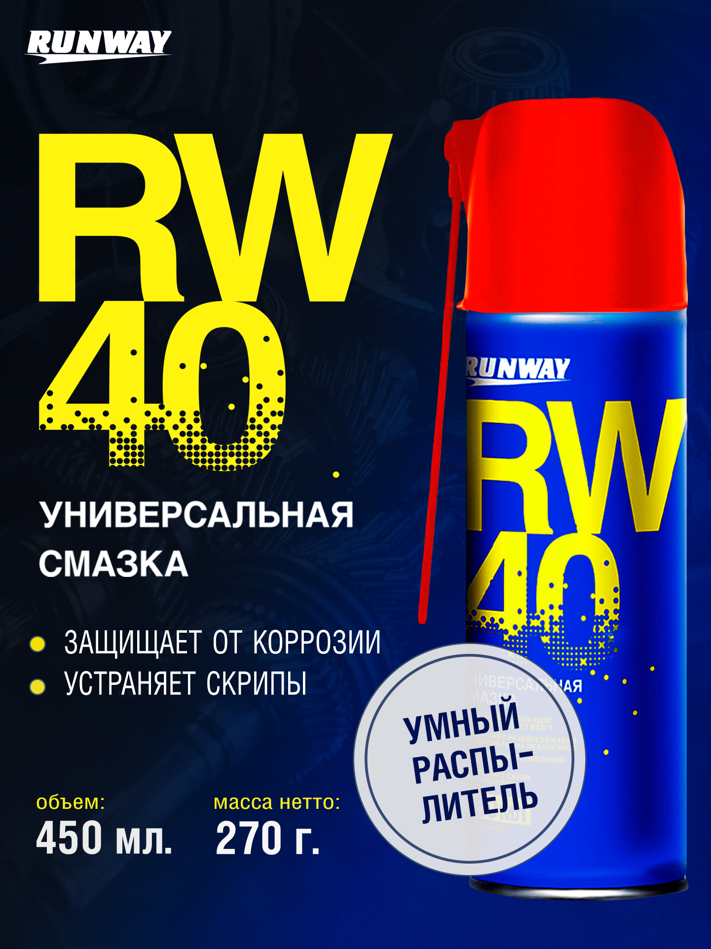 Многофункциональная смазка Runway RW-40 (аналог WD40) обладает отличными смазывающими и проникающими свойствами. Состав широко используется для ремонта автомобиля, мотоциклов и велосипедов, а также для очистки инструментов, смазки дверных и оконных петель, замков, для обработки различных движущихся механизмов.