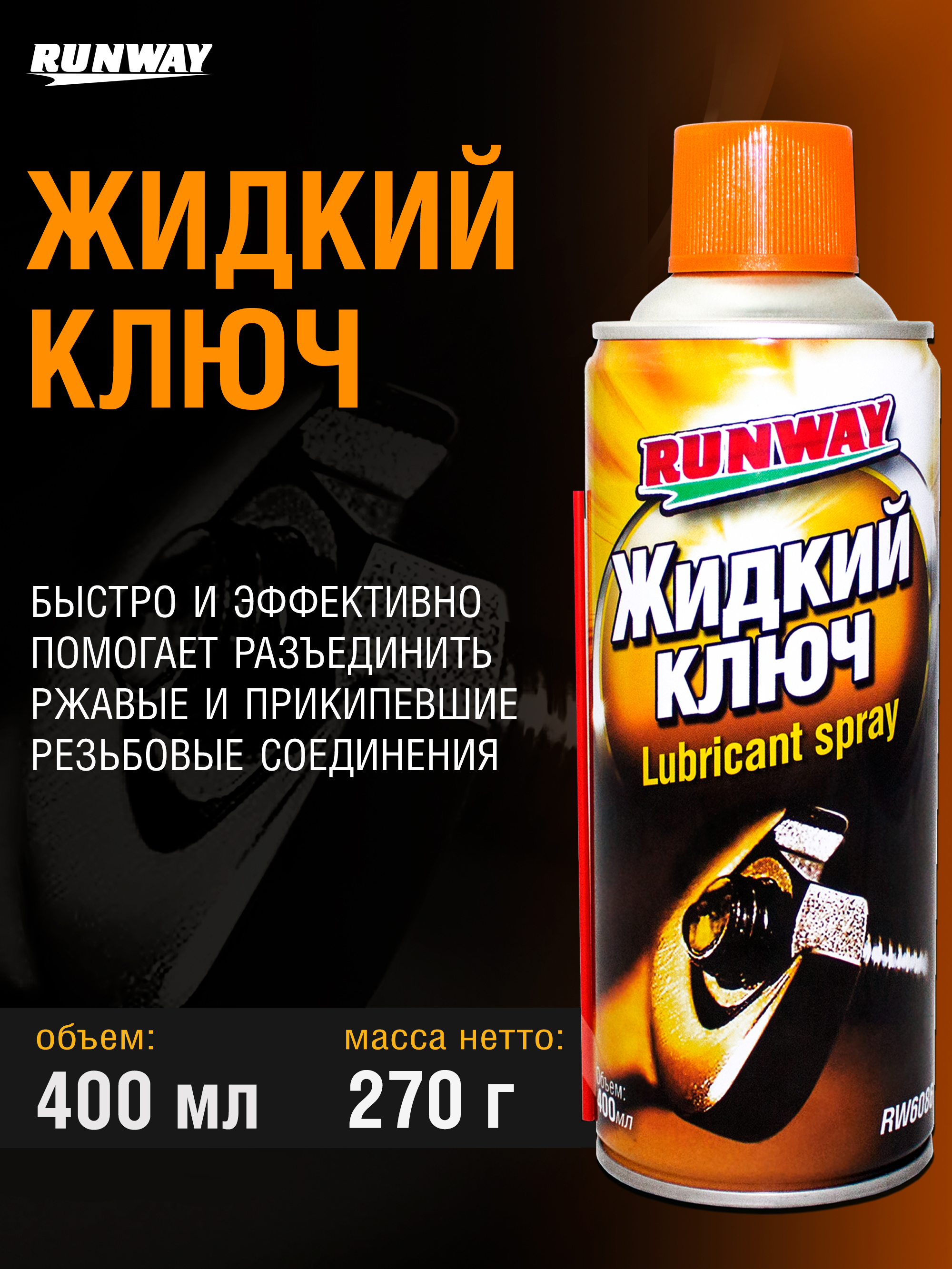 Жидкий ключ 400мл Runway – это универсальная проникающая антифрикционная смазка, которая незаменима в любом гараже или мастерской. Специалисты по ремонту автомобилей и домашние мастера по достоинству оценят его многочисленные преимущества.