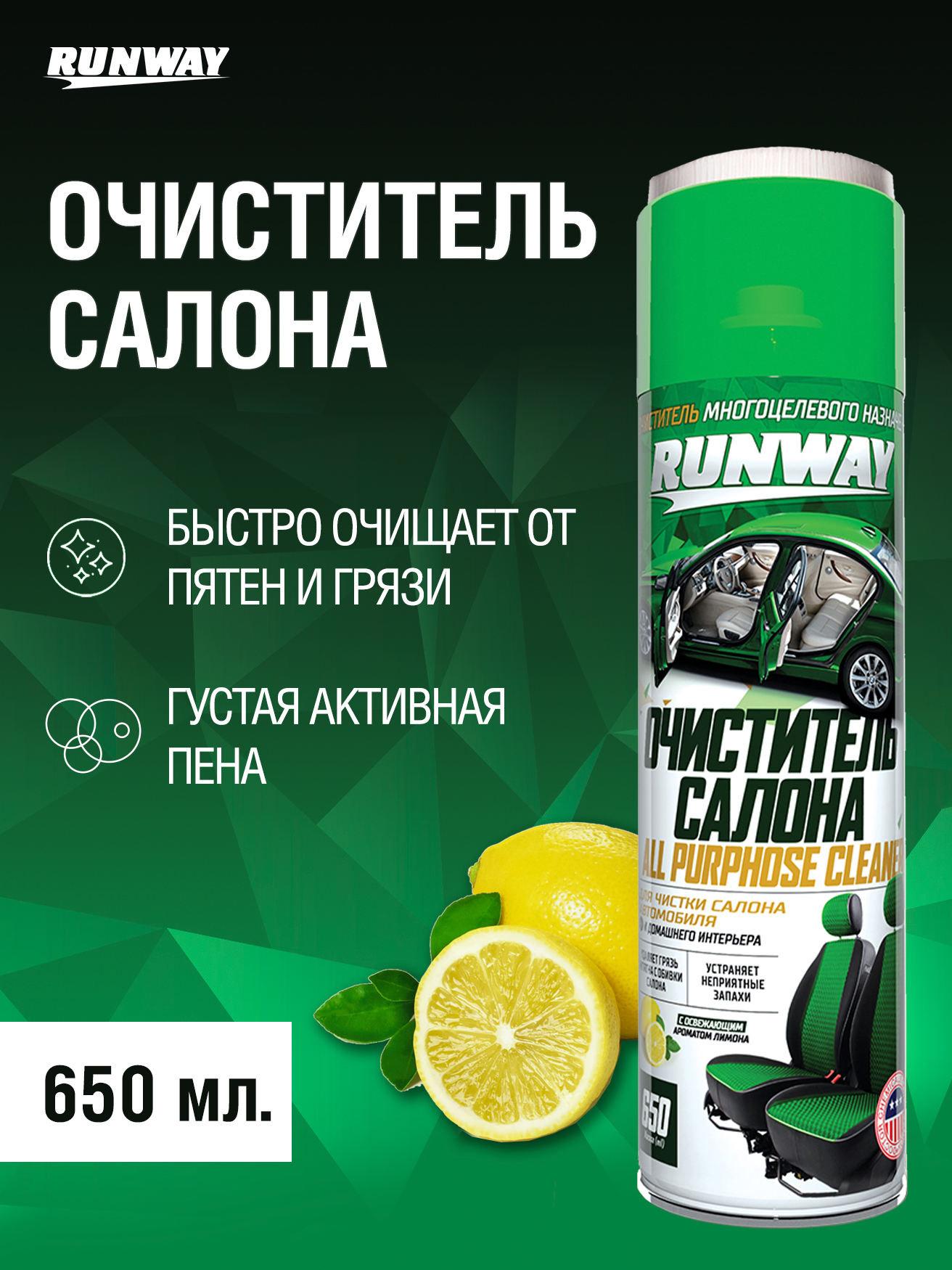 Очиститель салона автомобиля Runway предназначен для удаления разнообразных загрязнений и пятен с изделий из ткани, велюра, ковровых покрытий, пластика, торпедо и т. п. Быстро устраняет даже глубоко въевшуюся грязь. Удаляет неприятные запахи и освежает воздух в салоне автомобиля. Придает материалам антистатические свойства. Очиститель обивки салона RUWNAY удаляет большинство свежих пятен от чая, кофе, молока, соков, крови, губной помады, машинного масла и т.д. Применяется для очистки всего интерьера автомобиля, включая виниловые и пластиковые обивки, панель приборов, молдинги.