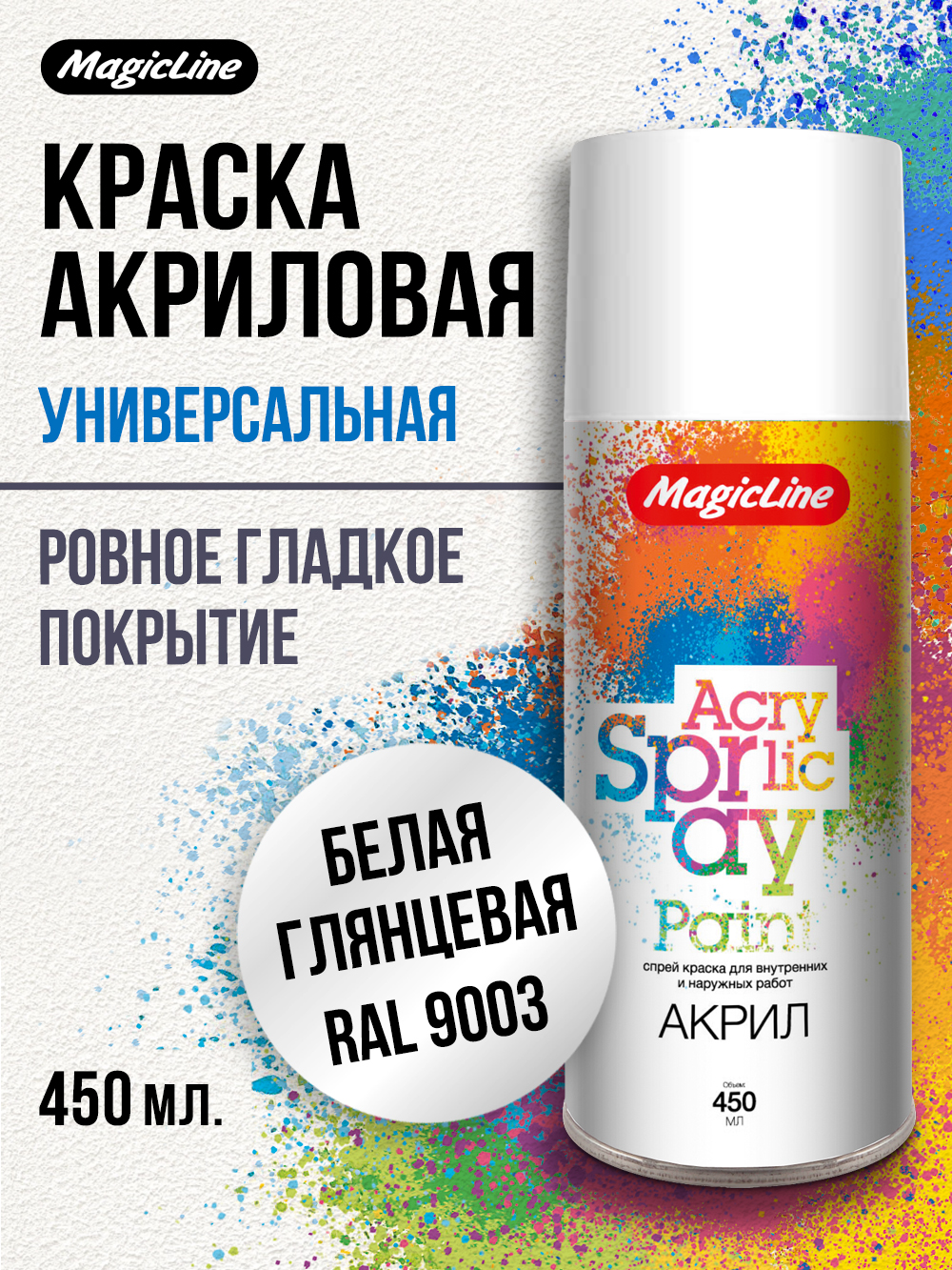 Аэрозольная акриловая краска MagicLine используется для внутренних и наружных работ.Не содержит хлорфторуглеродов.