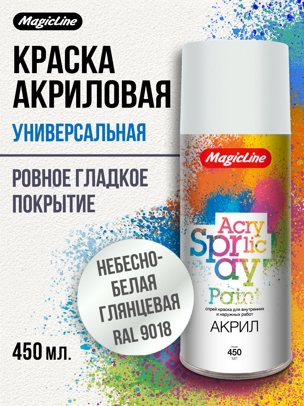 Аэрозольная акриловая краска MagicLine используется для внутренних и наружных работ.Не содержит хлорфторуглеродов.