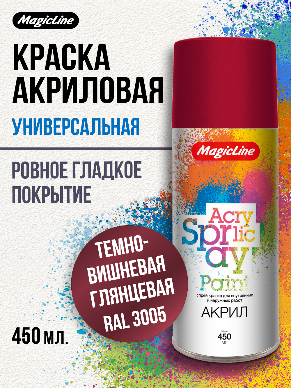 Аэрозольная акриловая краска MagicLine используется для внутренних и наружных работ.Не содержит хлорфторуглеродов.