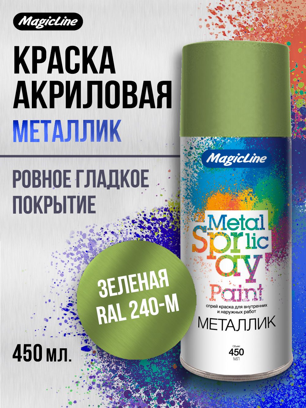 Аэрозольная краска металлик MagicLine изготовлена на основе современной синтетической смолы с добавлением металлического порошка. Обеспечивает образование особо прочного покрытия с эффектом металлик. Универсальная аэрозольная краска металлик в баллончике предназначена для окраски металлических, деревянных, стеклянных и других поверхностей, подвергающихся атмосферным воздействиям. Краска Хром и Золото MagicLine применяется для создания эффекта гальванизирования и особо устойчива к воздействию ультрафиолетового излучения.