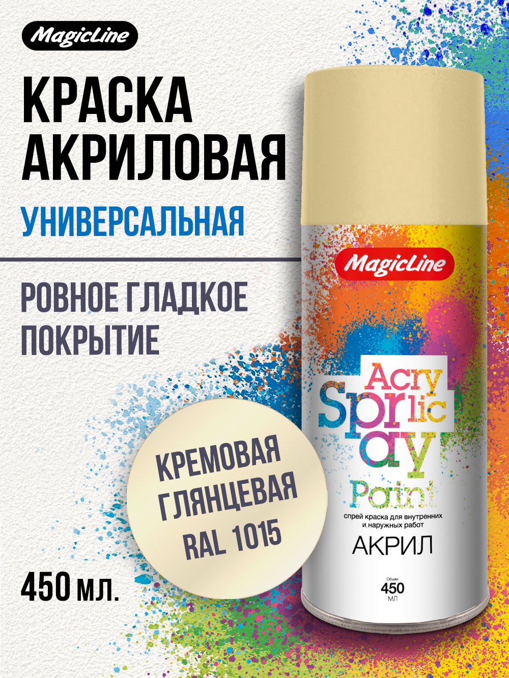 Аэрозольная акриловая краска MagicLine используется для внутренних и наружных работ.Не содержит хлорфторуглеродов.