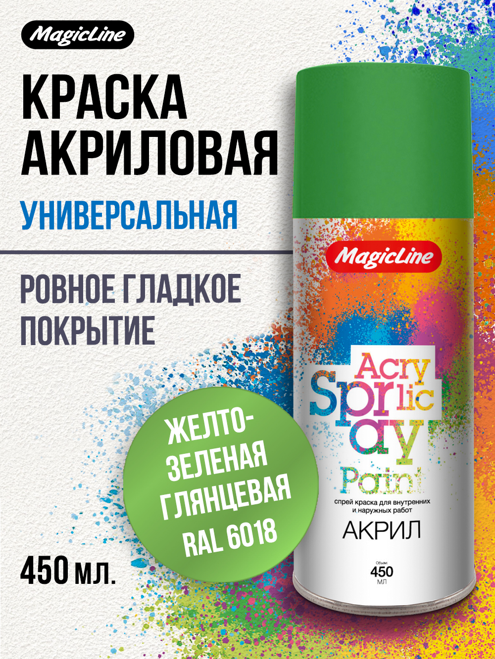 Аэрозольная акриловая краска MagicLine используется для внутренних и наружных работ.Не содержит хлорфторуглеродов.