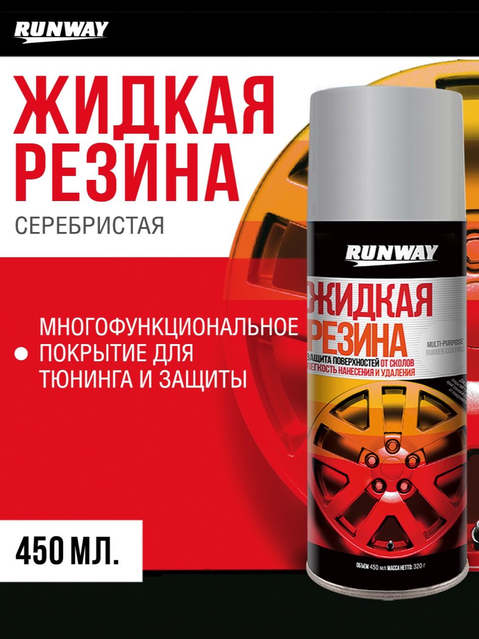Многофункциональное резиновое покрытие Жидкая резина RUNWAY – уникальный состав на основе синтетической резины. При распылении образует прочную защитную эластичную поверхность. Легко наносится, а при желании легко снимается-отрывается. После удаления не оставляет следов. Эффективно защищает от сколов, влаги, истирания, дорожных реагентов. Остается гибким, эластичным и не становится ломким в экстремальных погодных условиях от -30°С до 130°С. Обладает тепло- и звукоизоляционными свойствами. Имеет противоскользящий эффект. 100% водонепроницаемый. Может наносится на: металл, резину, пластик, дерево, стекло, стекловолокно, камень, бетон. Спрей идеально подходит для авто-вело-мото тюнинга и тюнинга водного транспорта: для дисков, кузова, рамы, решетки радиатора, ободов и т.д, в быту для: ноутбуков, электроприборов, кухонной мебели, граффити. Держится около 6-12 месяцев при надлежащем уходе. Важно: для получения насыщенного цвета (кроме черного) рекомендуется сначала нанести 1-2 слоя Жидкой резины RUNWAY белого цвета.