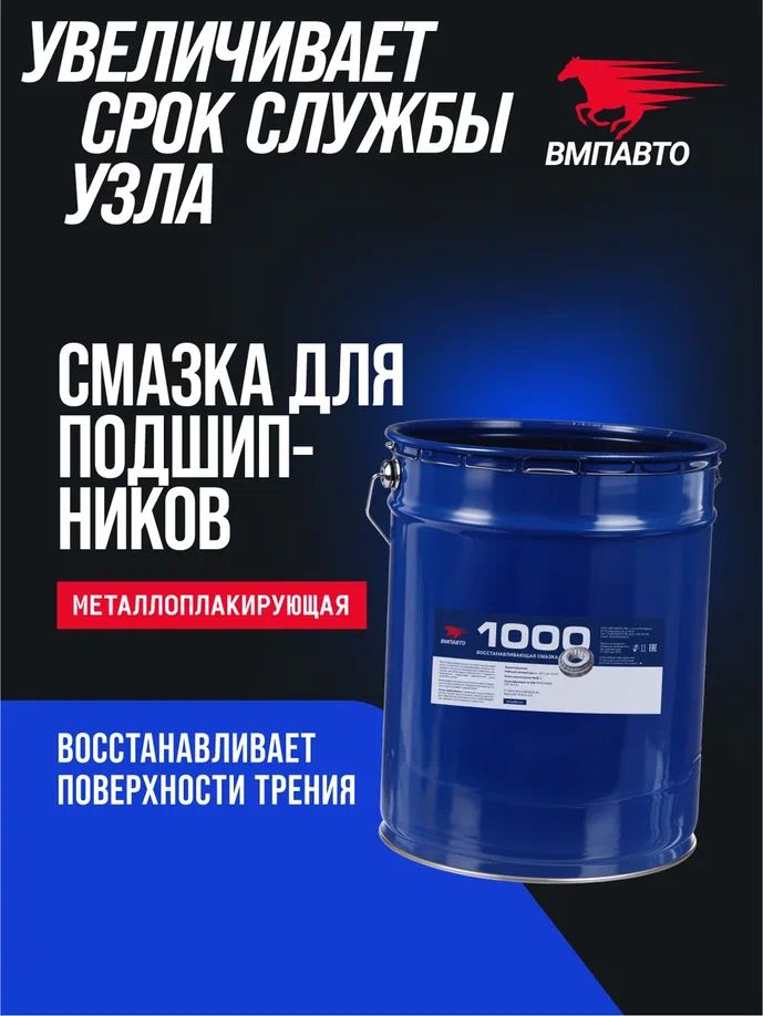 Пластичная смазка МС-1000 - универсальная металлоплакирующая смазка на литиевой основе с широким диапазоном рабочих температур. Обладает высокой термоокислительной стабильностью, содержит металлоплакирующие (способствующие восстановлению изношенных поверхностей), антикоррозионные и противозадирные компоненты. Преимущества: <ul><li>За счёт металлоплакирующих свойств значительно продлевает срок службы узлов трения;</li><li>Выдерживает большие, в том числе ударные, нагрузки;</li><li>Допускает однократное смазывание за счёт высокой термоокислительной и противокоррозионной способности;</li><li>Обладает хорошими уплотнительными свойствами:<br/><br/>Применение: применяется для смазывания подшипников качения и скольжения, в том числе в ступичных подшипниках, в подшипниках, установленных в электроприводах, в неразборных и разборных соединениях, насосных агрегатах. Уменьшает потери на трение и износ, способствует восстановлению изношенных поверхностей.</li><li>Рабочий температурный диапазон смазки: от - 40 С до +120 С (кратковременно до +140 С);</li><li>Тип загустителя: литиевое мыло;</li><li>Вязкость базового масла при 40 С: 60-80 сСт;</li><li>Температура каплепадения: не ниже +195 С;</li><li>Класс консистенции по NLGI: 3;</li><li>Коллоидная стабильность выделенного масла: не более 12 %;</li><li>Вымываемость водой из подшипника при +79 С: не более 6,0;</li><li>Минимальная температура применения в АЦСС: -15 С;</li><li>Коррозионное воздействие на металлы: выдерживает;</li><li>Воздействие на резину: изменение объёма и твёрдости: не более +-10 %.</li></ul>
