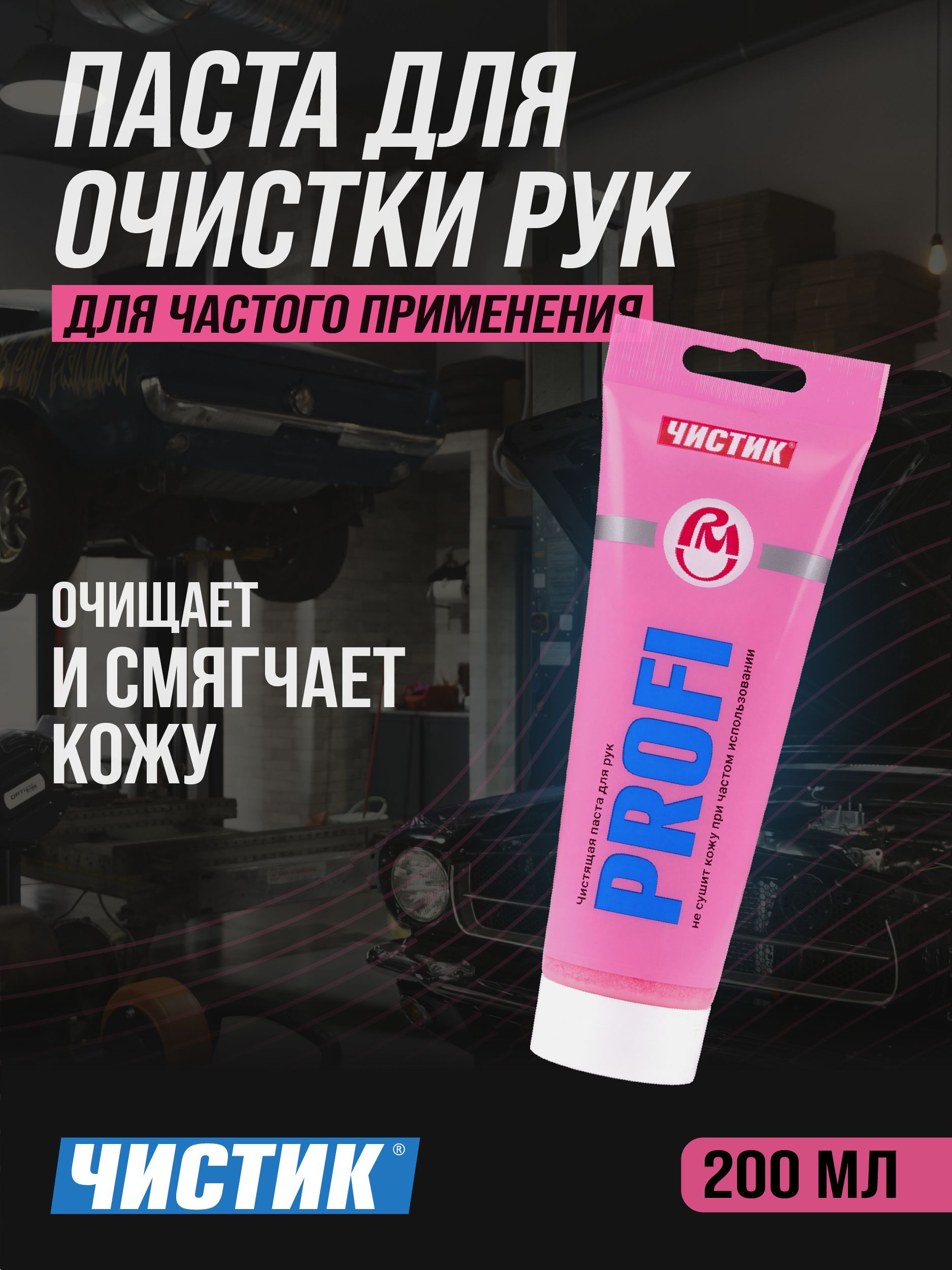 Средство для очистки рук от устойчивых загрязнений Чистик PROFI — идеально подходит для частого применения и профессионального использования. Чистящее средство содержит мягкий скраб и добавки смягчающие кожу. Паста имеет приятный запах. Не вызывает аллергических реакций. Хорошо чистит, не раздражает кожу рук. Пользуется авторитетом у мастеров автосервисов. Удаляет такие загрязнения как: смазки, масла, сажа, пыль. Чистик PROFI содержит активные моющие вещества, которые расщепляют сильные загрязнители, и выводят токсины из кожи. Благодаря мягкому скрабу, чистящая паста для рук отшелушивает остатки грязи, и очищает поры от вредных бактерий. Не содержит растворителей.